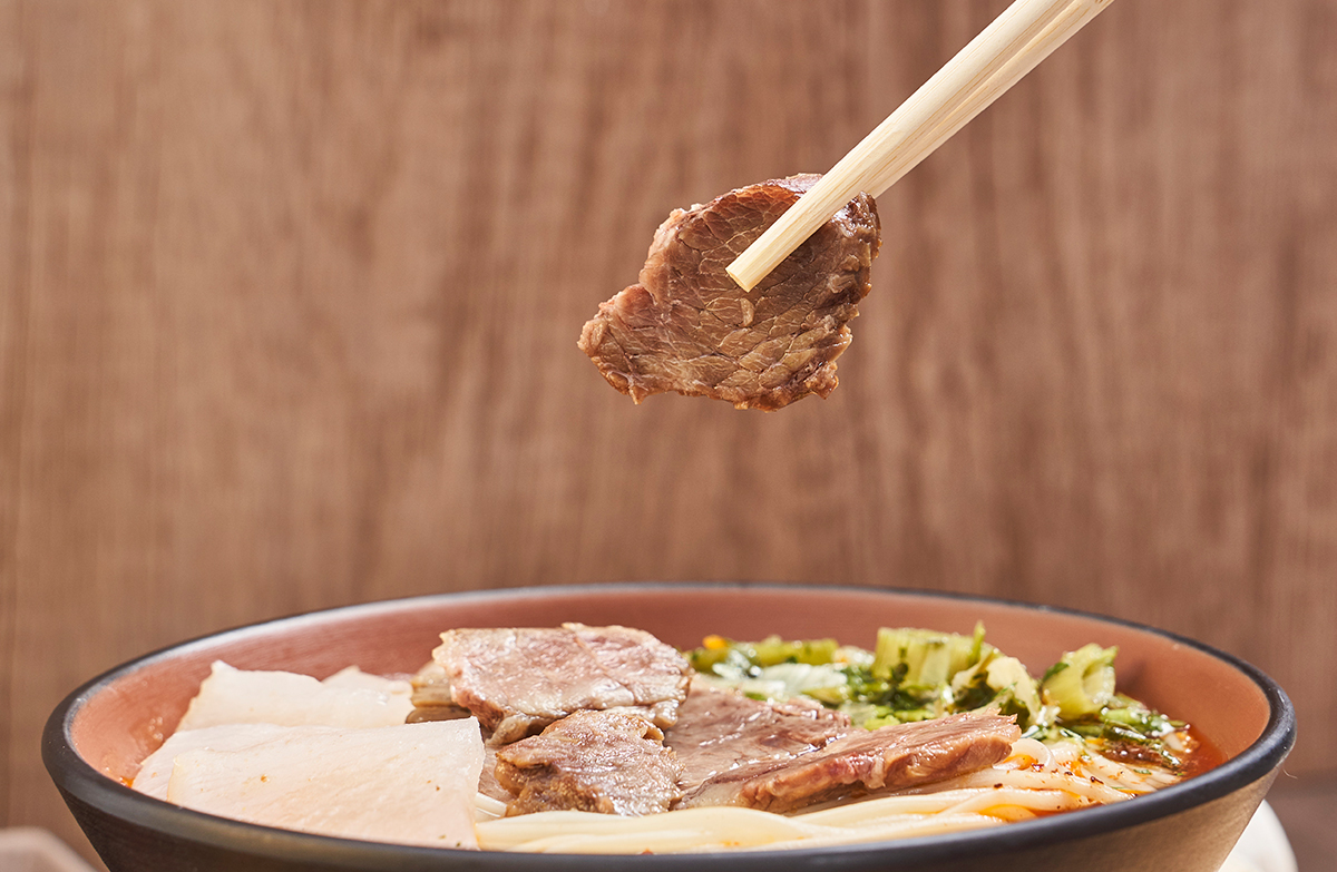 瓷面江湖对此进行了上百次的配方调试,还原了具有仪式感的兰州牛肉面头汤,鲜美醇香,实打实的兰州做派。通过牛肉+牛骨的双重慢熬8小时,保证了牛肉汤清而不浑的状态。并且开创式地使用低温冷萃技术,锁鲜锁香,有效防止了蛋白质钙化和营养的流失。一口清汤入喉,即刻穿越兰州城。